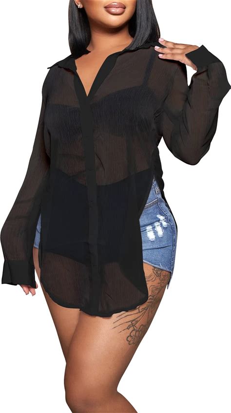 Womens Sheer Button Up Blouse Sexy Long Sleeve Mesh See Through Shirts Tops