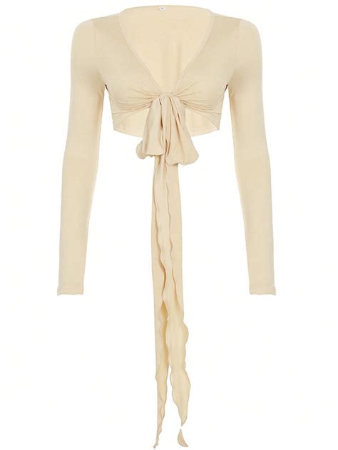 Women Fitness Yoga T-Shirts Solid Tie-Up Front V-Neck Long Sleeve Bottoming Jersey Shirt Seamless Workout Crop Tops Shrugs,S