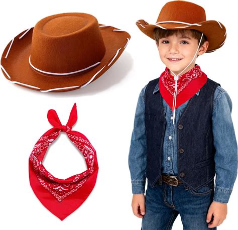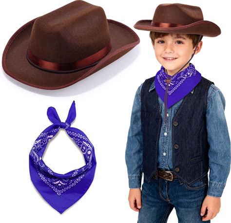 Haysandy 24 Pieces Western Cowboy Hat Set, Felt Cowboy Themed Party Hats With Paisley Bandanas For Kids Costume Party(Brown, Pink, Red)