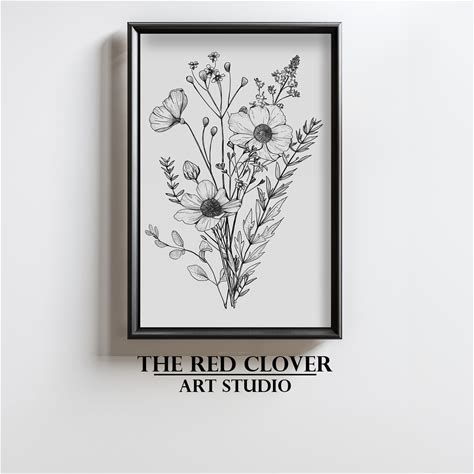 Lovely Wildflower Bouquet Art Print Line Art Flowers Floral Illustration Flower Sketch Black & Off-White Botanical Art Digital Download N211
