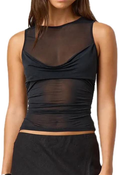 Women Sheer Mesh Tank Top Y2k Sleeveless See Through Ruched Tops