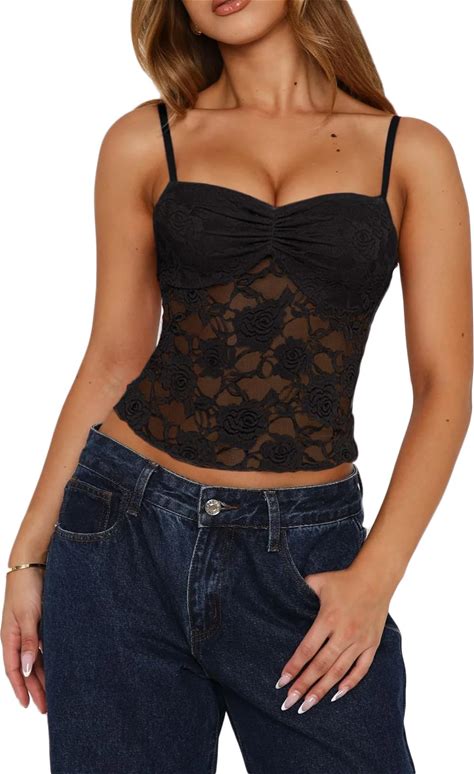 Meihuida Women Lace Top Y2k Going Out Trendy Sexy Mesh See Through Cami Tank Tops