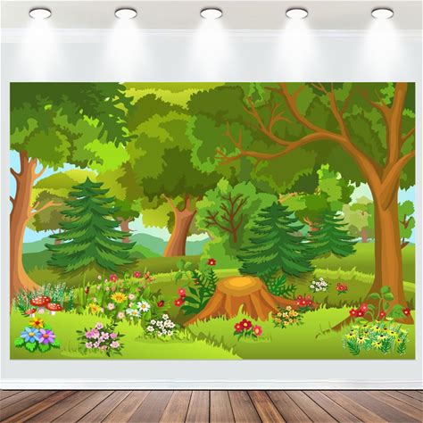 Fabric 7x5ft Cartoon Forest Backdrop Colorful Wild Flowers Green Trees Grassland Photography Background Kids Birthday Baby Shower Party Banner School