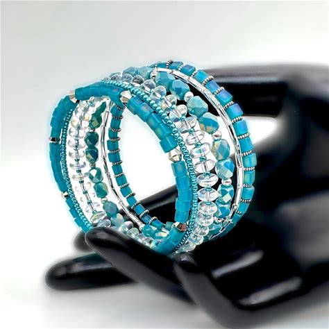 Beaded Memory Wire Bangle Bracelet In Blue Colors
