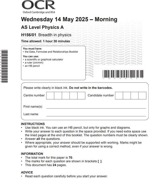 2025 OCR AS Level Physics A Paper 1 + Mark Scheme Breadth In Physics H156 01