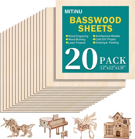 MITINU 20 Pack Basswood Sheets For Crafts,12"X12"X1/8" 3mm Thick Plywood Sheets With Smooth Surfaces-Unfinished Squares Wood Boards For Laser Cutting,